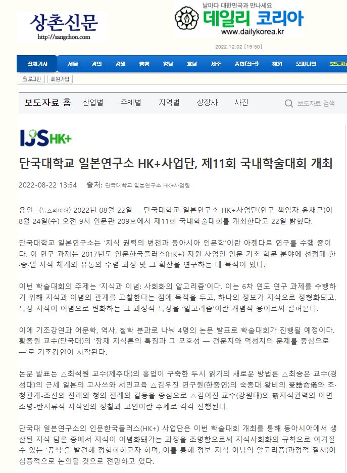 [데일리대한민국 2022. 08. 22] 단국대학교 일본연구소 HK+사업단, 제11회 국내학술대회 개최