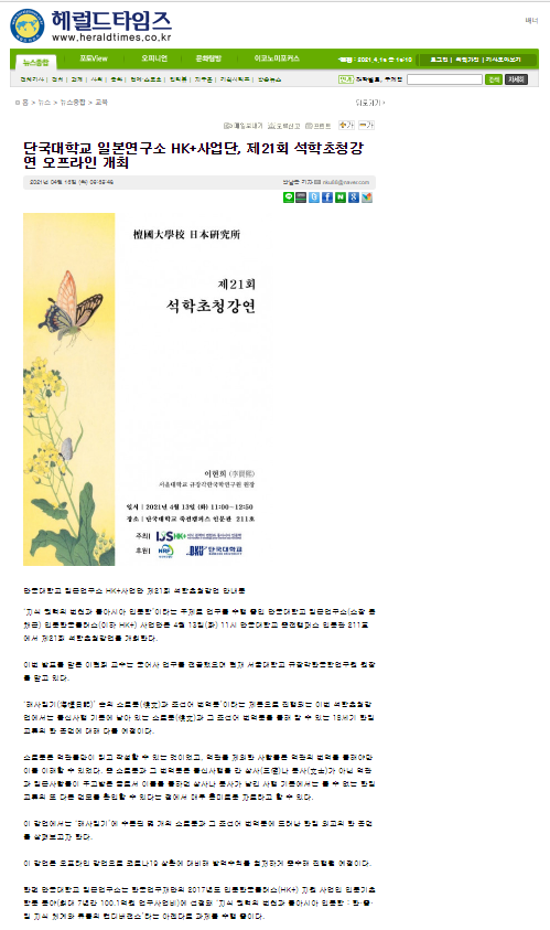 [헤럴드타임즈 2021.04.13] 단국대학교 일본연구소 HK+사업단, 제21회 석학초청강연 오프라인 개최