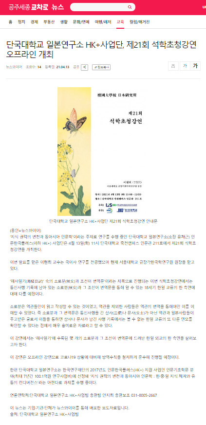 [공주세종교차로뉴스 2021.04.13] 단국대학교 일본연구소 HK+사업단, 제21회 석학초청강연 오프라인 개최