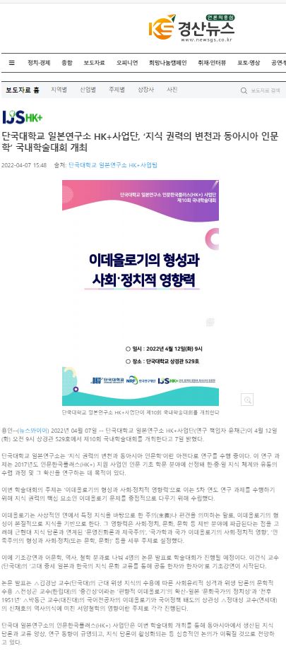 [경산자치신문 2022. 04. 07] 단국대학교 일본연구소 HK+사업단, ‘지식 권력의 변천과 동아시아 인문학’ 국내학술대회 개최