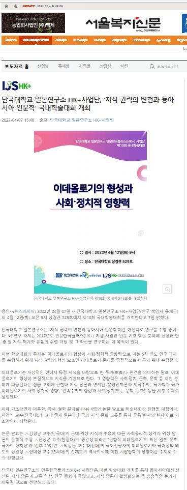 [서울복지신문 2022. 04. 07] 단국대학교 일본연구소 HK+사업단, ‘지식 권력의 변천과 동아시아 인문학’ 국내학술대회 개최