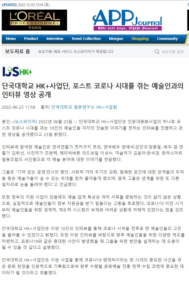 [APP저널 2022. 06. 23] 단국대학교 HK+사업단, 포스트 코로나 시대를 겪는 예술인과의 인터뷰 영상 공개