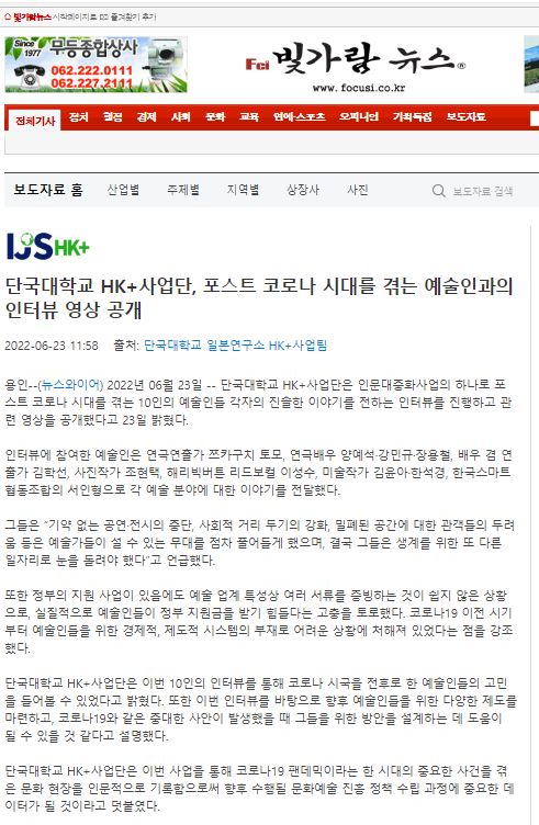 [빛가람뉴스 2022. 06. 23] 단국대학교 HK+사업단, 포스트 코로나 시대를 겪는 예술인과의 인터뷰 영상 공개