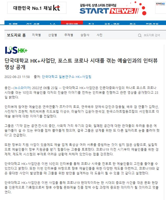 [스타트뉴스 2022. 06. 23] 단국대학교 HK+사업단, 포스트 코로나 시대를 겪는 예술인과의 인터뷰 영상 공개