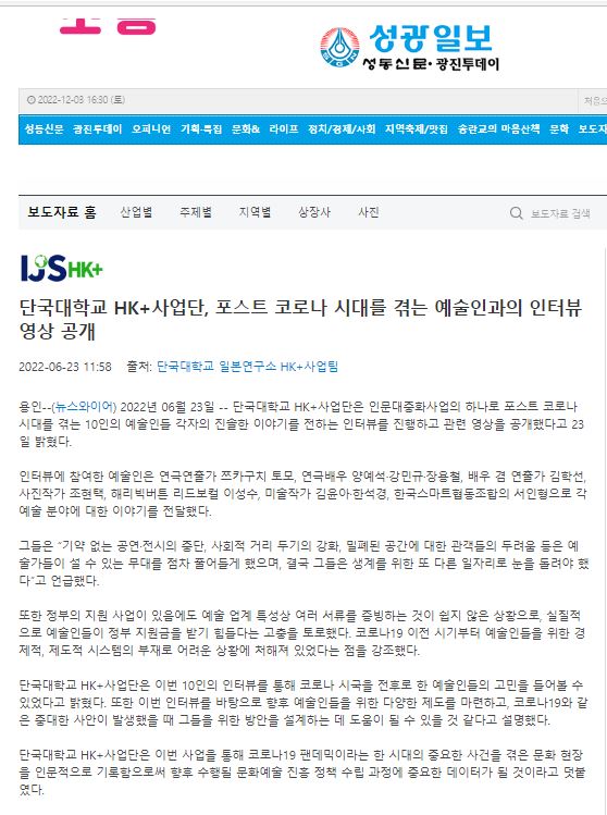 [성광일보 2022. 06. 23] 단국대학교 HK+사업단, 포스트 코로나 시대를 겪는 예술인과의 인터뷰 영상 공개