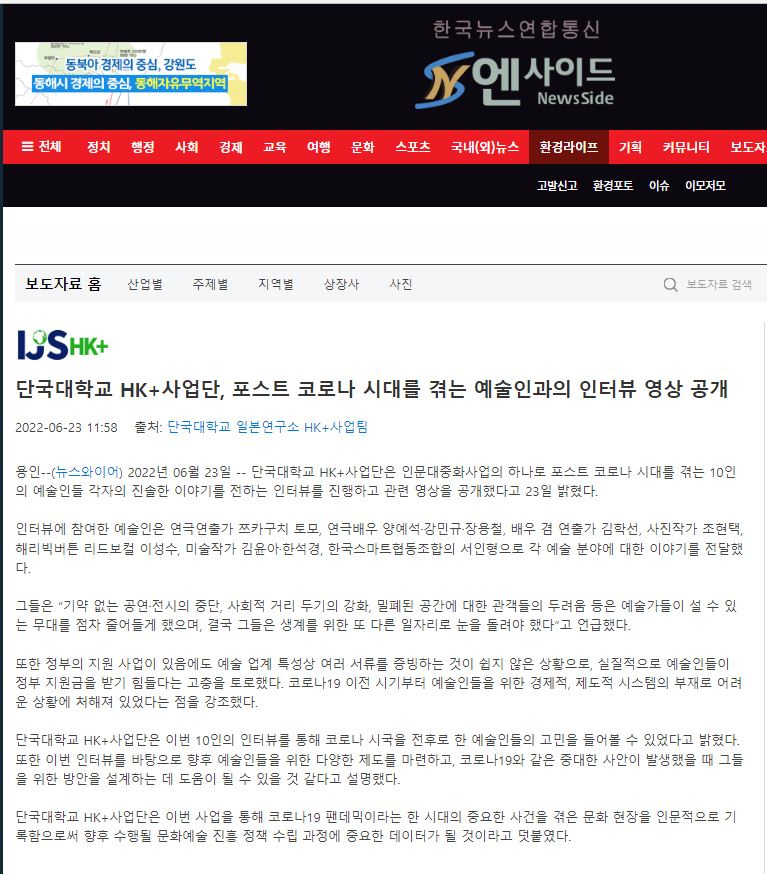 [시사코리아저널 2022. 06. 23] 단국대학교 HK+사업단, 포스트 코로나 시대를 겪는 예술인과의 인터뷰 영상 공개