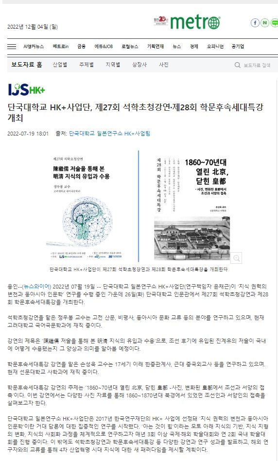 [메트로 2022. 07. 19] 단국대학교 HK+사업단, 제27회 석학초청강연·제28회 학문후속세대특강 개최