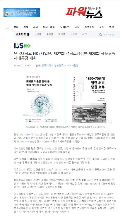 [파워뉴스 2022. 07. 19] 단국대학교 HK+사업단, 제27회 석학초청강연·제28회 학문후속세대특강 개최