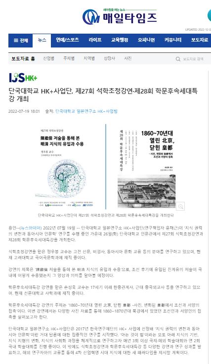 [매일타임즈 2022. 07. 19] 단국대학교 HK+사업단, 제27회 석학초청강연·제28회 학문후속세대특강 개최