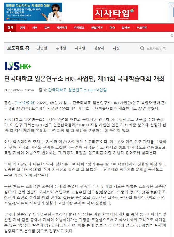 [시사타임 2022. 08. 22] 단국대학교 일본연구소 HK+사업단, 제11회 국내학술대회 개최