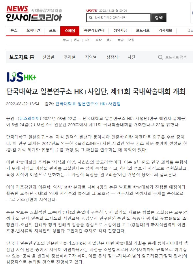 [인사이드코리아 2022. 08. 22] 단국대학교 일본연구소 HK+사업단, 제11회 국내학술대회 개최