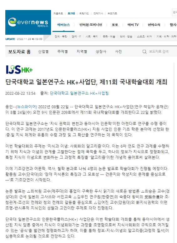 [에버뉴스 2022. 08. 22] 단국대학교 일본연구소 HK+사업단, 제11회 국내학술대회 개최