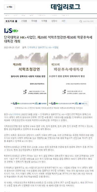 [데일리로그 2022. 09. 20] 단국대학교 HK+사업단, 제29회 석학초청강연·제30회 학문후속세대특강 개최