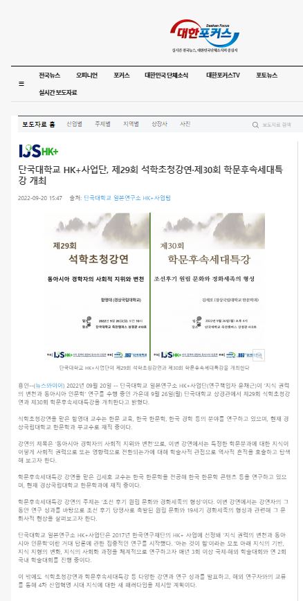[대한포커스 2022. 09. 20] 단국대학교 HK+사업단, 제29회 석학초청강연·제30회 학문후속세대특강 개최