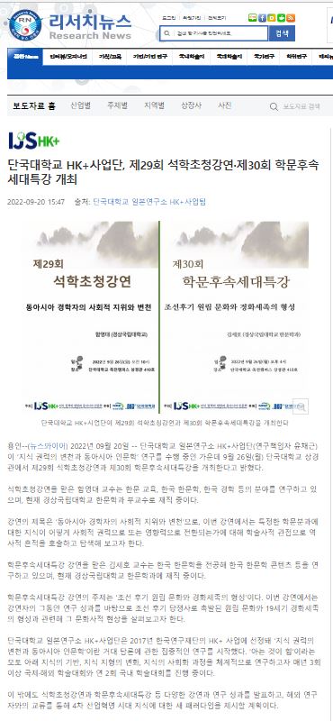 [리서치뉴스 2022. 09. 20] 단국대학교 HK+사업단, 제29회 석학초청강연·제30회 학문후속세대특강 개최