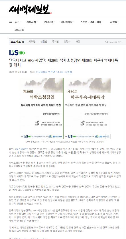 [새백제일보 2022. 09. 20] 단국대학교 HK+사업단, 제29회 석학초청강연·제30회 학문후속세대특강 개최