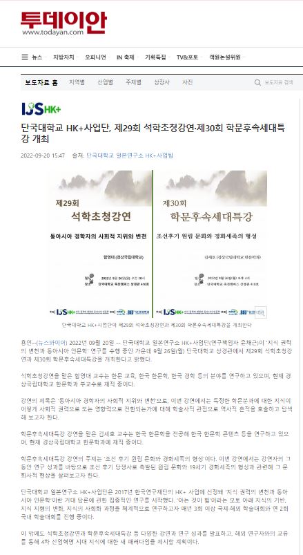 [투데이안 2022. 09. 20] 단국대학교 HK+사업단, 제29회 석학초청강연·제30회 학문후속세대특강 개최