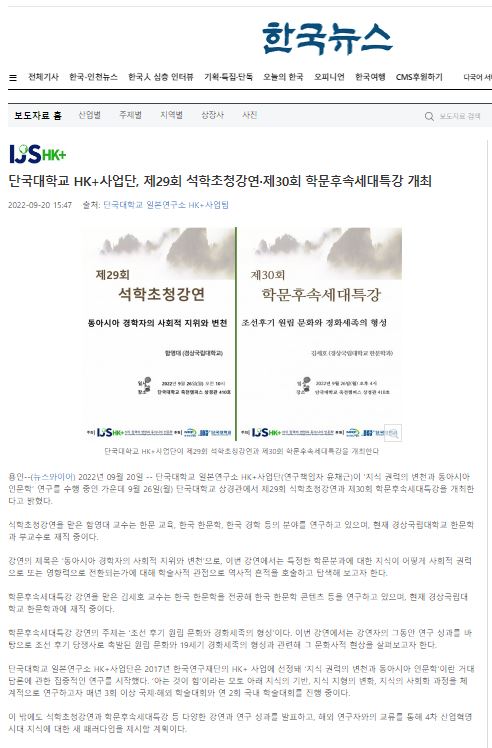 [한국뉴스 2022. 09. 20] 단국대학교 HK+사업단, 제29회 석학초청강연·제30회 학문후속세대특강 개최