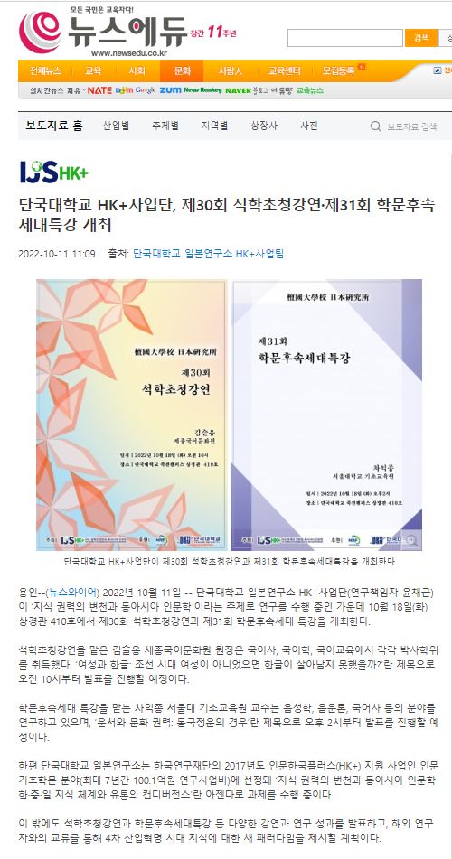[뉴스에듀 2022. 10. 11] 단국대학교 HK+사업단, 제30회 석학초청강연·제31회 학문후속세대특강 개최