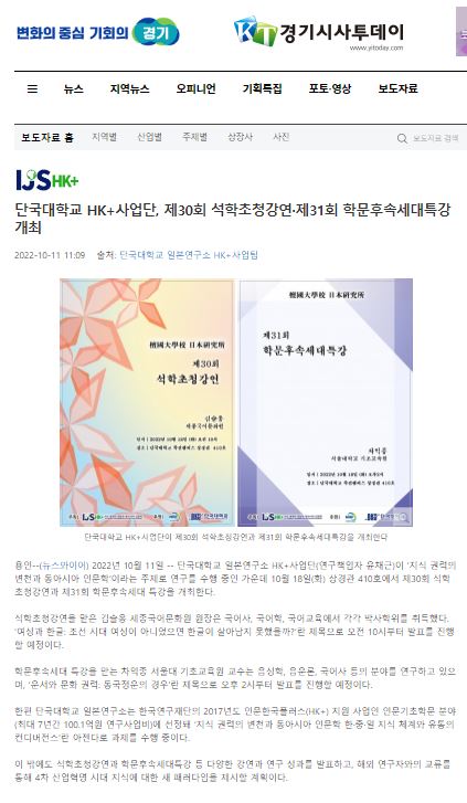 [경기시사투데이 2022. 10. 11] 단국대학교 HK+사업단, 제30회 석학초청강연·제31회 학문후속세대특강 개최