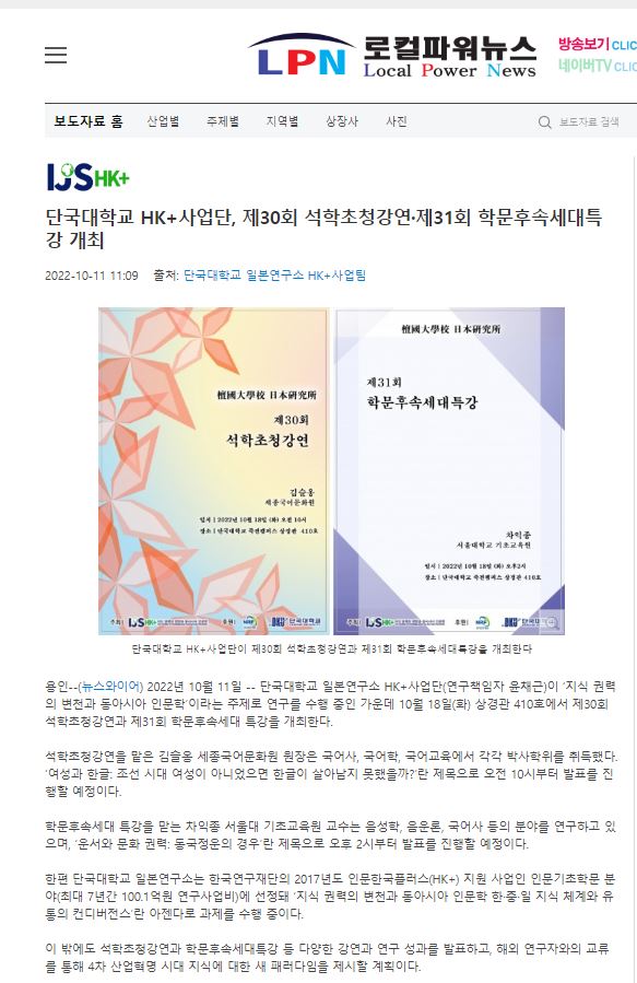 [LPN로컬파워뉴스 2022. 10. 11] 단국대학교 HK+사업단, 제30회 석학초청강연·제31회 학문후속세대특강 개최
