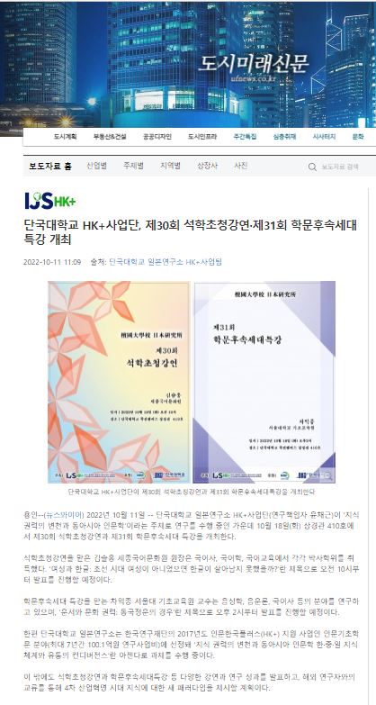 [도시미래신문 2022. 10. 11] 단국대학교 HK+사업단, 제30회 석학초청강연·제31회 학문후속세대특강 개최