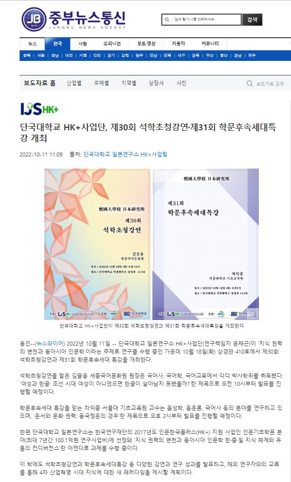 [중부뉴스통신 2022. 10. 11] 단국대학교 HK+사업단, 제30회 석학초청강연·제31회 학문후속세대특강 개최