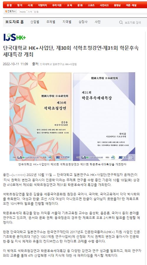 [중부뉴스통신 2022. 10. 11] 단국대학교 HK+사업단, 제30회 석학초청강연·제31회 학문후속세대특강 개최