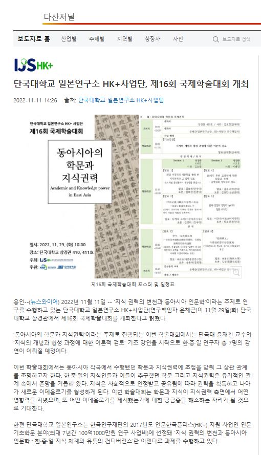 [다산저널 2022. 11. 11] 단국대학교 일본연구소 HK+사업단, 제16회 국제학술대회 개최