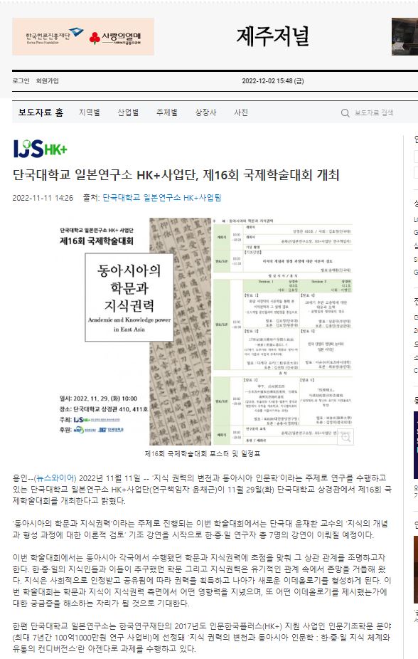 [제주저널 2022. 11. 11] 단국대학교 일본연구소 HK+사업단, 제16회 국제학술대회 개최