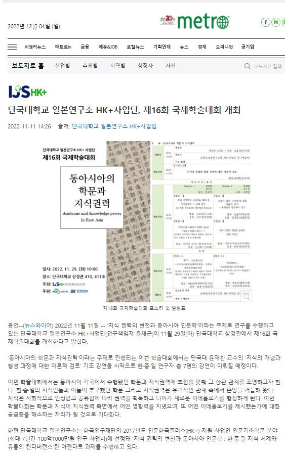 [메트로 2022. 11. 11] 단국대학교 일본연구소 HK+사업단, 제16회 국제학술대회 개최