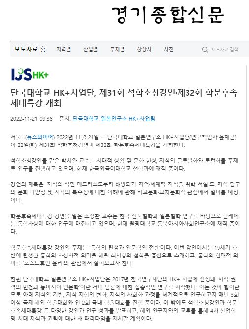 [경기종합신문 2022. 11. 21] 단국대학교 HK+사업단, 제31회 석학초청강연·제32회 학문후속세대특강 개최