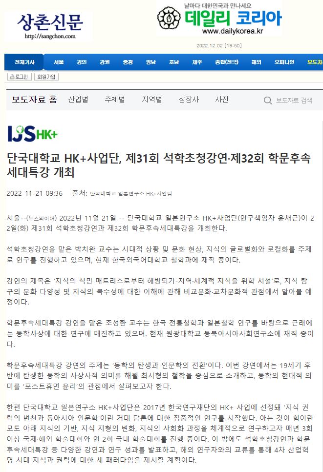 [데일리대한민국 2022. 11. 21] 단국대학교 HK+사업단, 제31회 석학초청강연·제32회 학문후속세대특강 개최