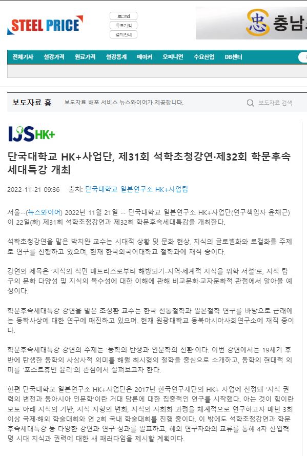 [스틸프라이스 2022. 11. 21] 단국대학교 HK+사업단, 제31회 석학초청강연·제32회 학문후속세대특강 개최