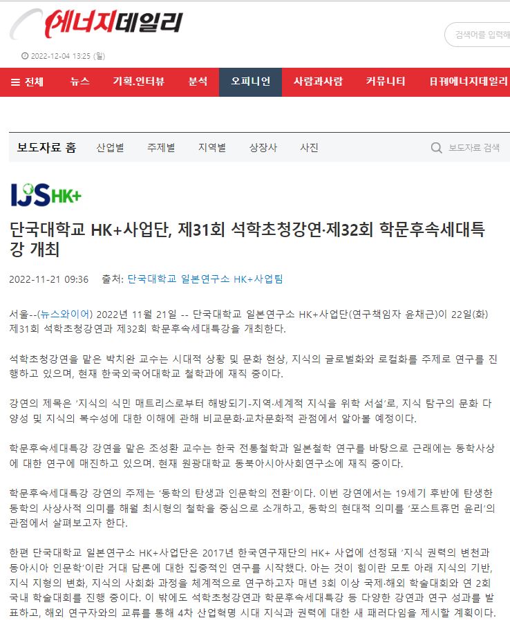[에너지데일리 2022. 11. 21] 단국대학교 HK+사업단, 제31회 석학초청강연·제32회 학문후속세대특강 개최