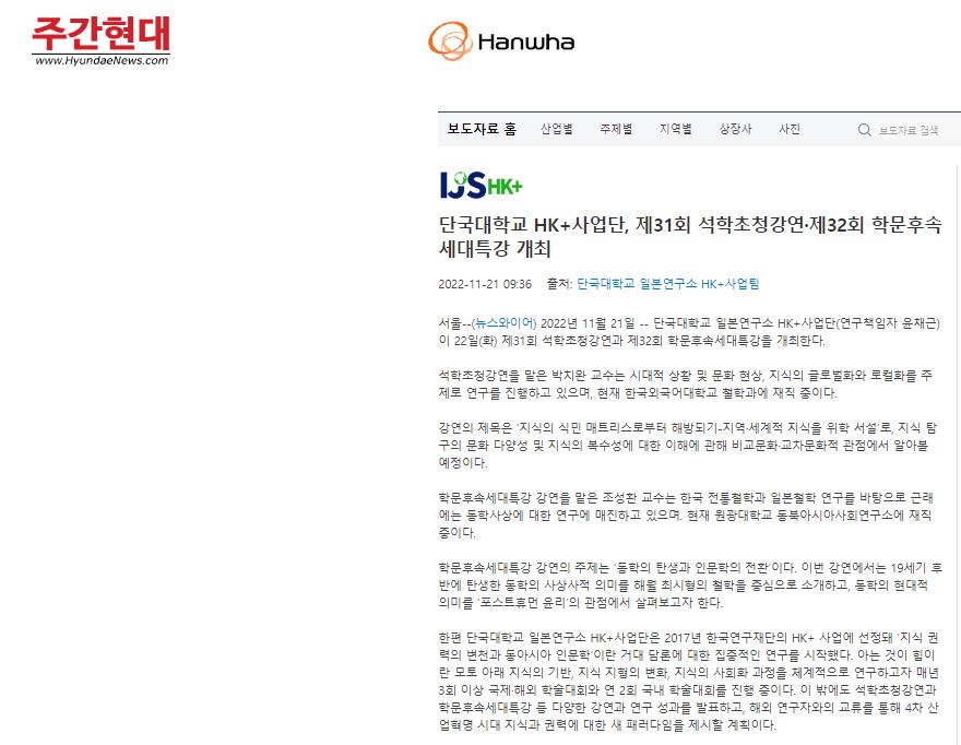 [주간현대 2022. 11. 21] 단국대학교 HK+사업단, 제31회 석학초청강연·제32회 학문후속세대특강 개최
