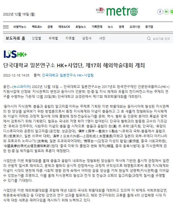 [메트로 2022. 12. 18] 단국대학교 일본연구소 HK+사업단, 제17회 해외학술대회 개최