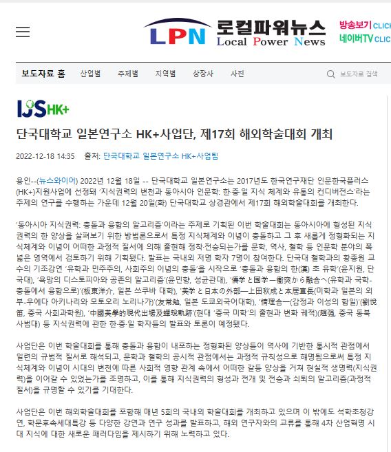 [LPN로컬파워뉴스 2022. 12. 18] 단국대학교 일본연구소 HK+사업단, 제17회 해외학술대회 개최